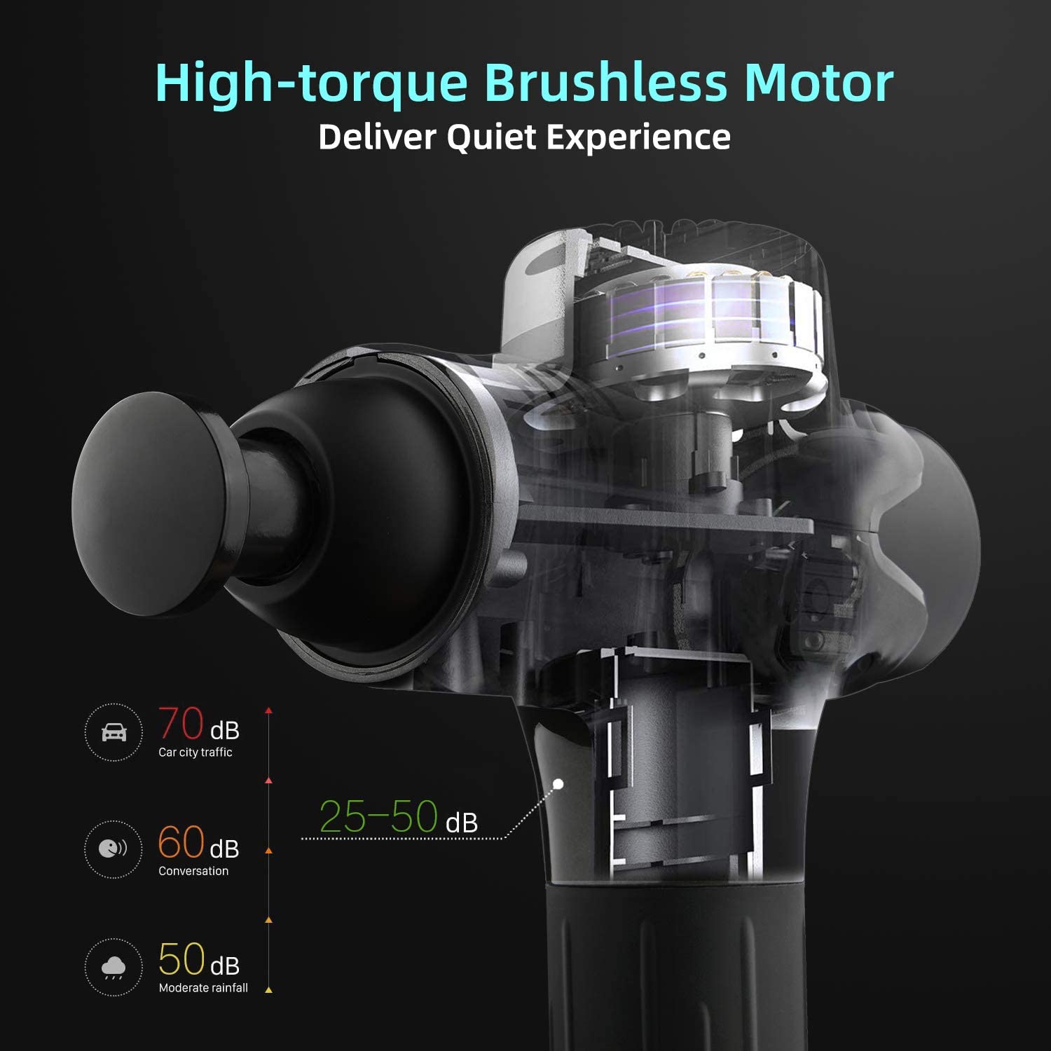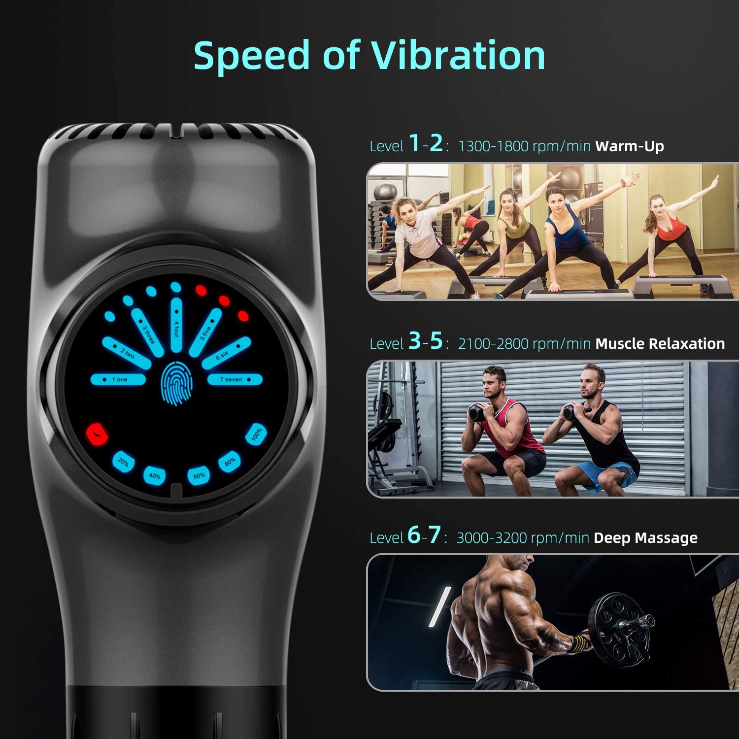 אקדח עיסוי שקט: שקט למדי במהלך העבודה, רק כ- 25- 55dB, 7 הגדרות מהירות שנעות בין 1300 ל -3,200 סל"ד, נפגשות עם קבוצות שרירים שונות ומספקות עיסוי רקמות עמוק ונהדר.