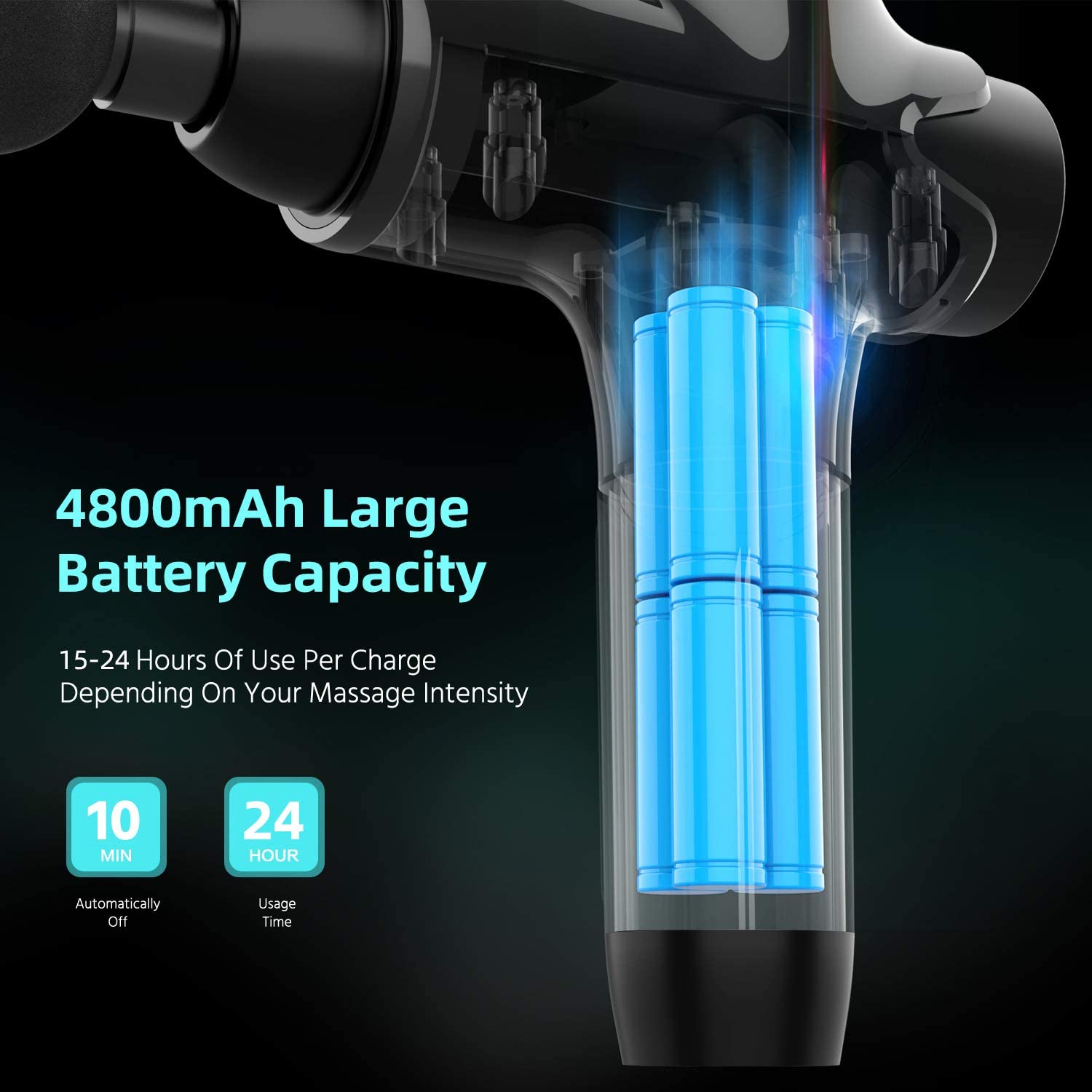 חיי סוללה ארוכים: אקדח העיסוי סטאר פרו מקס מצויד בסוללת ליתיום בנפח 4800 מיליאמפר / נמשך בין 15-24 שעות לשימוש בעיסוי בטעינה אחת ! (תלוי בעוצמת העיסוי שבה אתם משתמשים). קצב מתח הטעינה הוא 100V-240V 50 / 60Hz מקס 0.5A.
