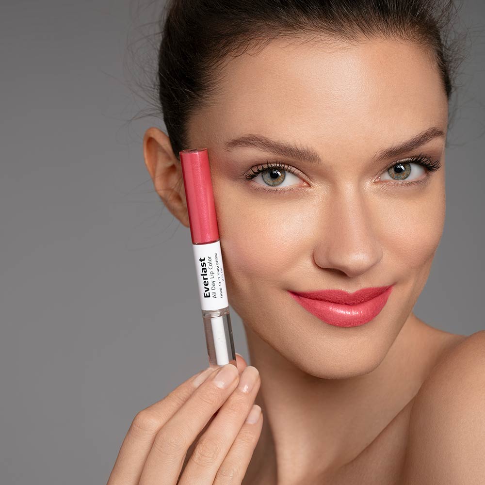 שפתון עמיד וליפ-גלוס באריזה אחת EVERLAST אריזה קומפקטית ונוחה לשימוש המשלבת שפתון וגלוס לאיפור שפתיים מושלם. שפתון  דו-צדדי מעניק מראה שפתיים מלאות ברק למשך שעות ארוכות.